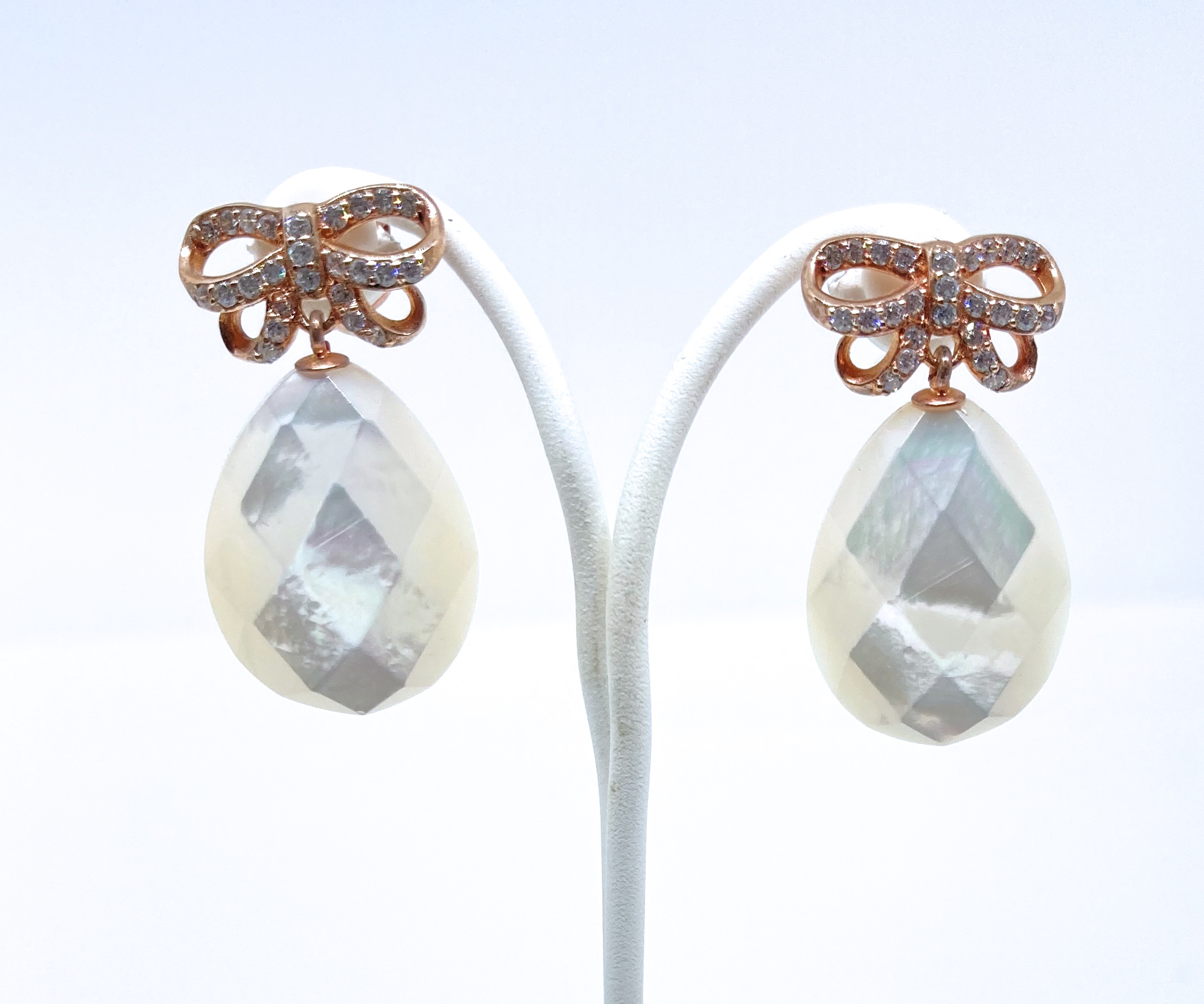 La parte superior del pendiente , es un bonito lazo con circonitas,hecho en plata con acabado de oro rosa.