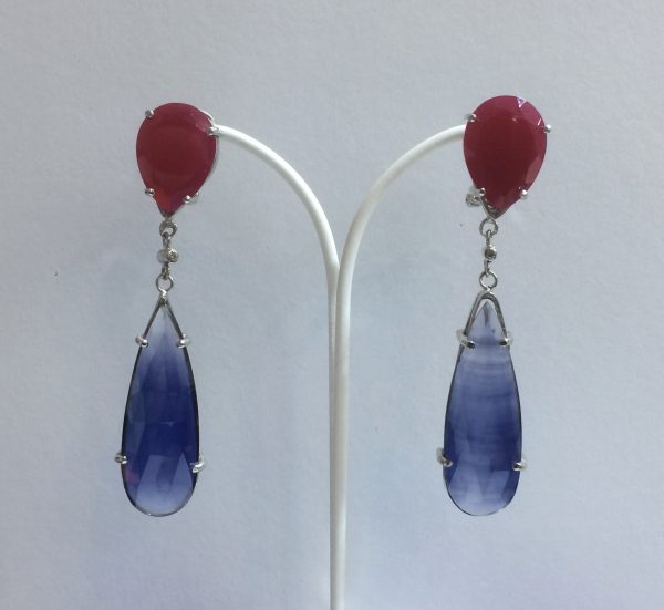 Dos calcedonias pera en la parte superior , y como nexo ,dos chatones de oro blanco con dos pequeños brillantes.