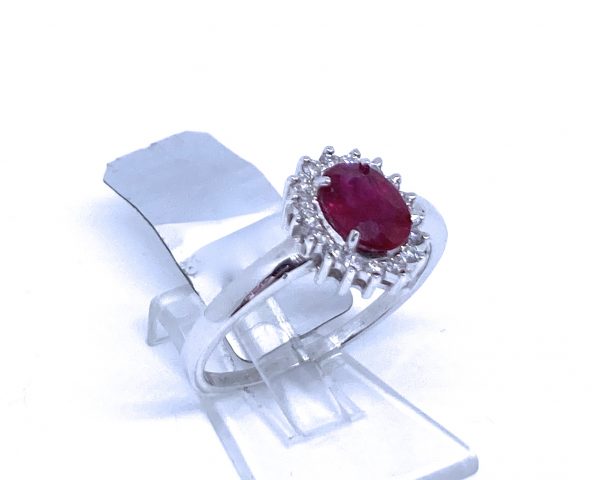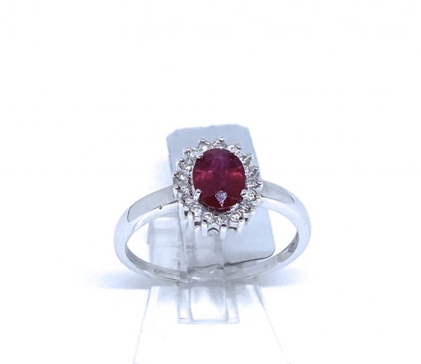 Home Oro Sortija Rubí Birmania en talla oval orlado de brillantes.